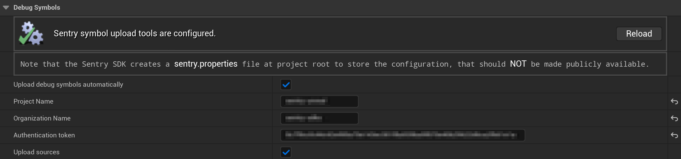 The automated debug symbols upload is disabled by default and requires configuration. To configure it, navigate to Project Settings > Plugins > Sentry, then enter the Auth Token, Organization Slug, and Project Name. Note, that the Unreal Engine SDK automatically creates a sentry.properties file at the root of your project directory to store the configuration. This configuration file should never be made publicly available.